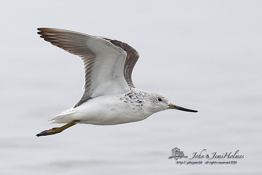 Nordmann’s Greenshank, molting into alternate plumage, showing diagnostic all-white wing-linings and mostly white tail. (Mai Po Nature Reserve, Hong Kong; April 20, 2016.) © 不正