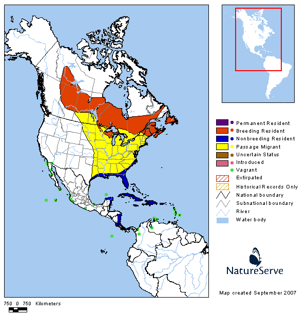 Breeds in the boreal forest zone of North America. Winters from the southeastern U.S. to the West Indies and Central America.