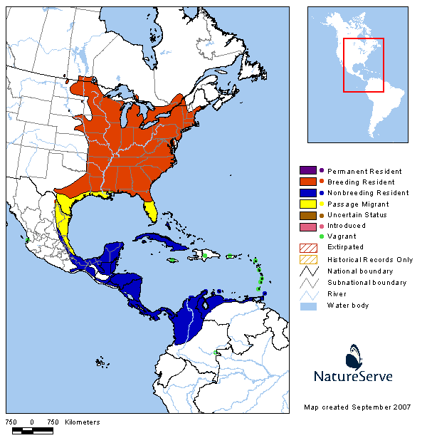 Breeds in eastern North America. Winters from eastern Mexico to Colombia, Venezuela, and the West Indies.